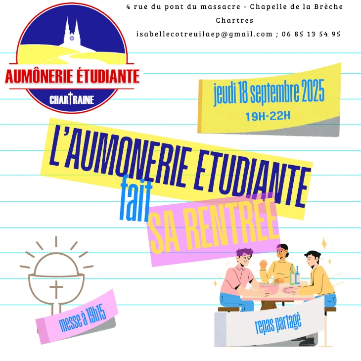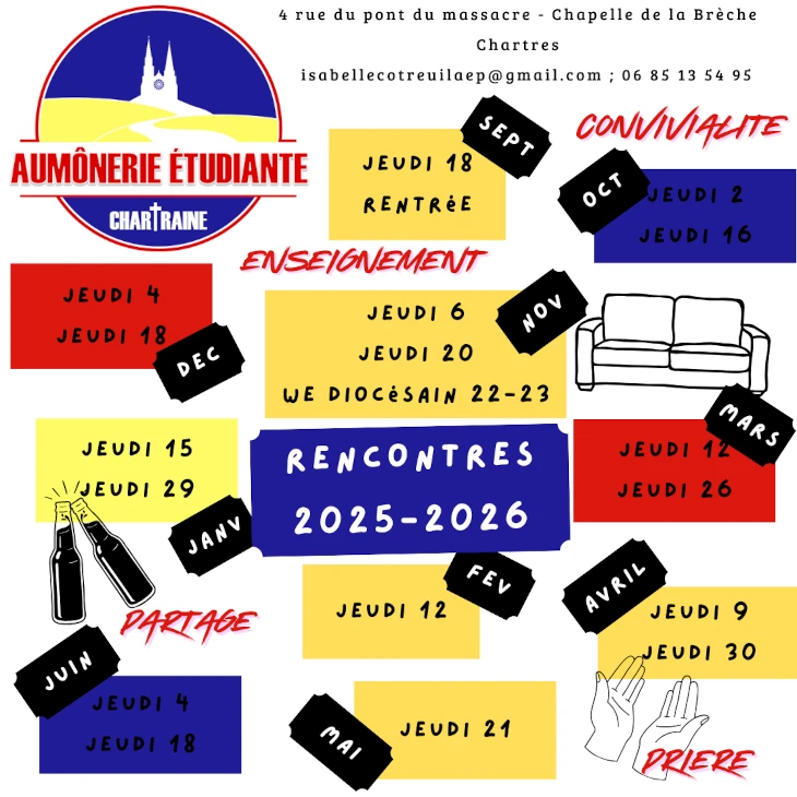 L’aumônerie catholique propose aux étudiants de réfléchir ensemble sur des sujets divers et variés. Avec un repas convivial (apporté par vos soins) et un temps de prière, nos rencontres proposeront soit un partage thématique, soit un temps d’enseignement, soit un partage autour de la Parole de Dieu…